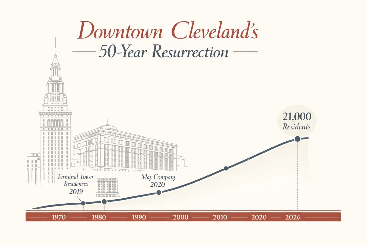 Downtown Cleveland's population has grown 12% since 2019, now sitting at roughly 21,000 residents. That growth isn't driven by new construction it's driven by resurrection. Approximately 30 historic structures have been converted into apartments, hotels, and mixed-use buildings since 2013 alone, backed by state and federal historic tax incentives that make the numbers pencil out on buildings that would otherwise sit vacant and deteriorating.