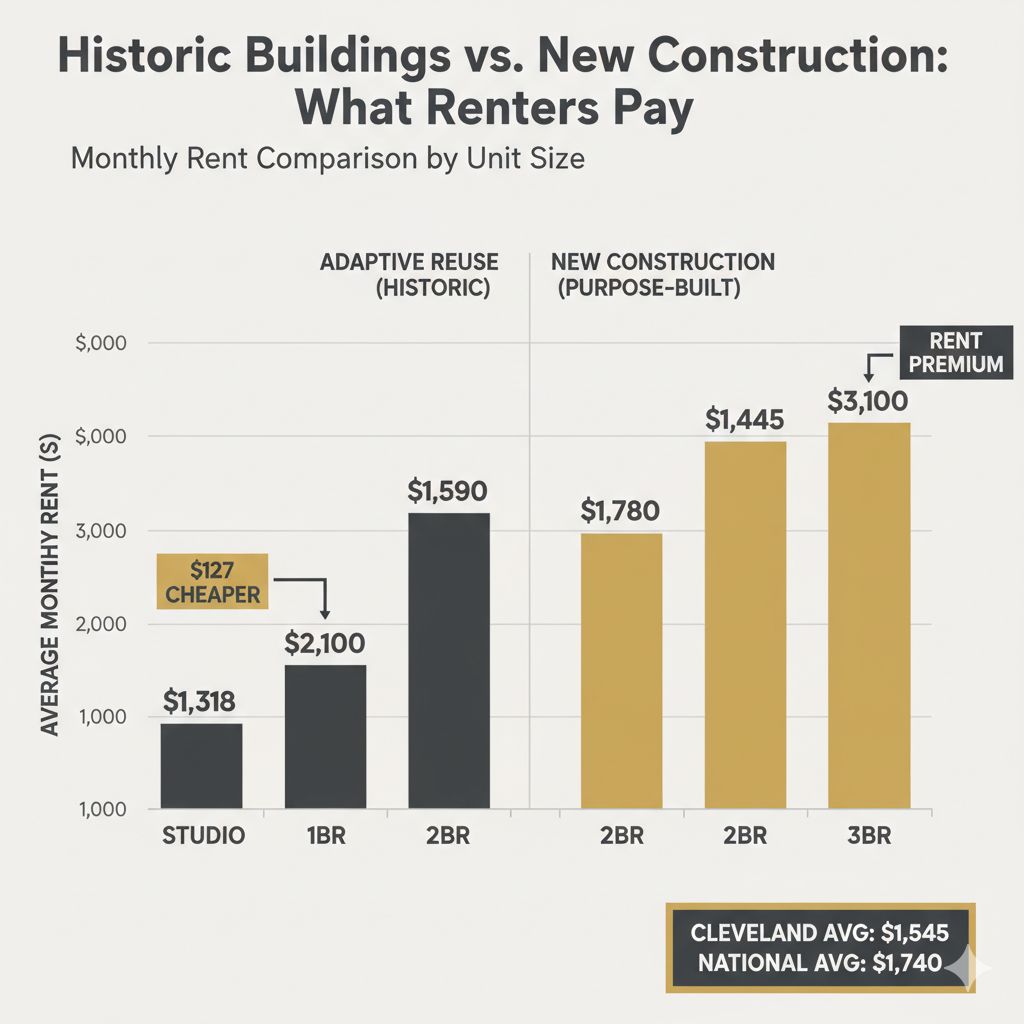 Adaptive reuse is also winning on affordability. Studios in historic conversion buildings averaged $1,083/month over the past three years, versus $1,210 in purpose-built housing. One- and two-bedrooms follow the same discount pattern.